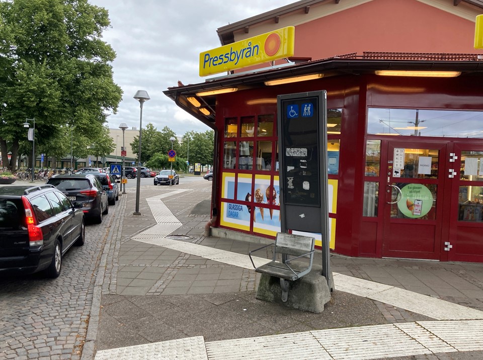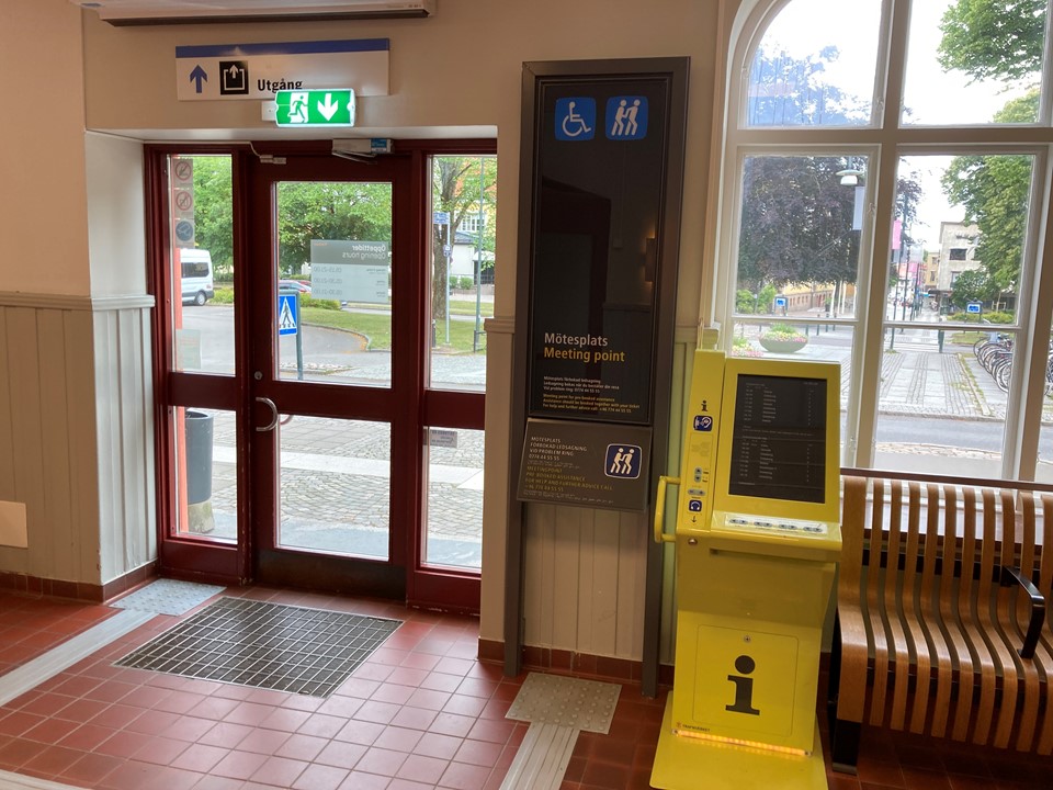 Ute. Till höger om stationshuset vid Pressbyrån.