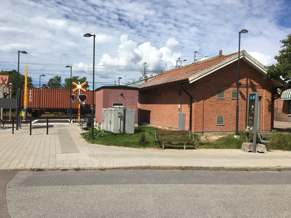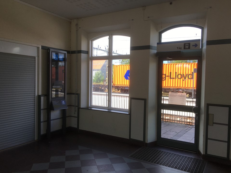 Ute. Till vänster om stationshuset nära övergången till plattform.