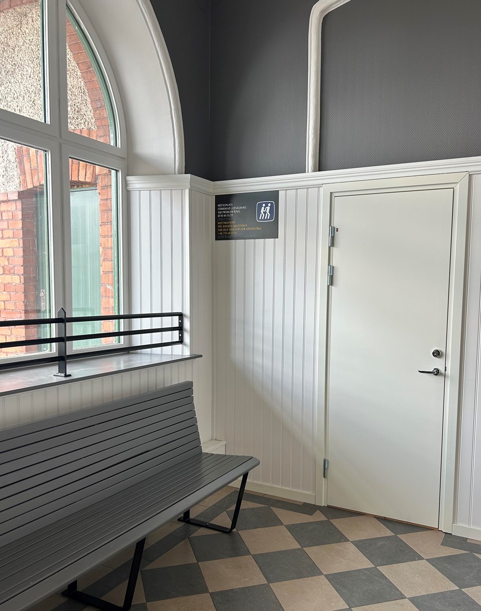 Inne. Till vänster om entrén från bussplanen.
