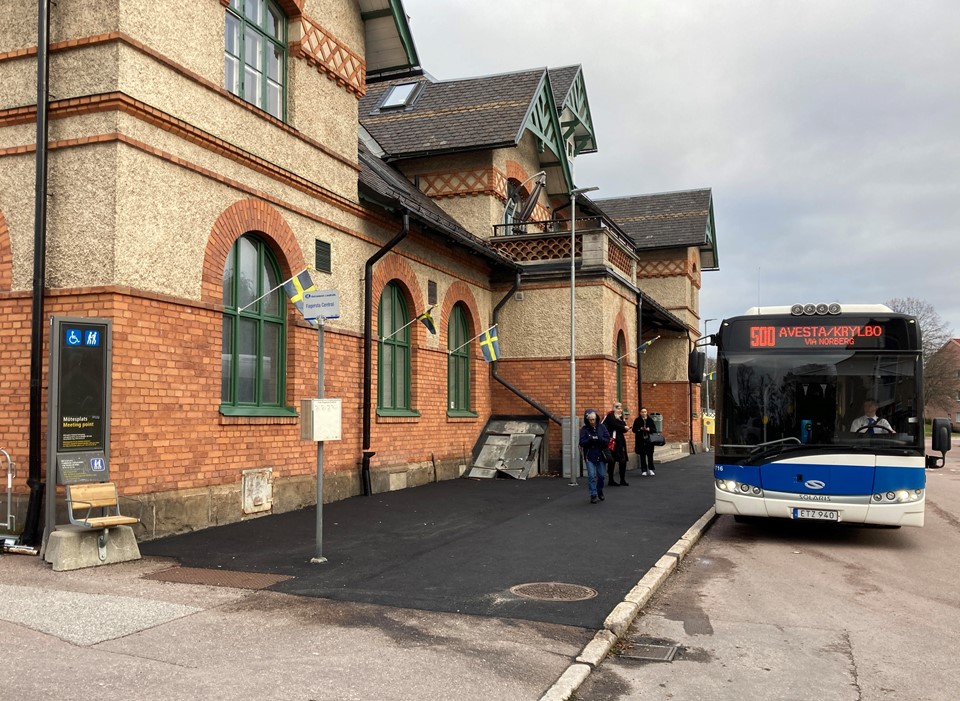 Ute. Vid vänstra kortsidan av stationshuset nära busshållplatsen.