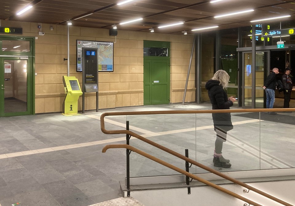 Inne. I väntsalen till vänster om entrén från taxiangöringen nära nedgången till spår 2-3.