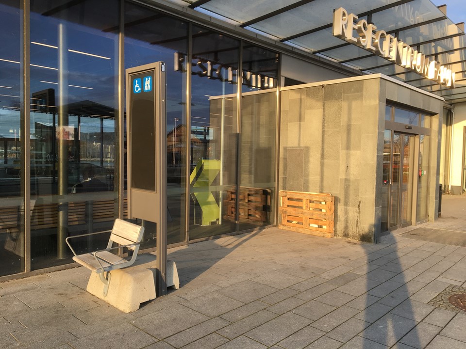 Ute. Till vänster om entren till Resecentrum, nära taxiangöring.