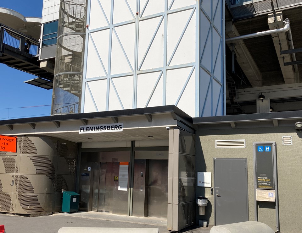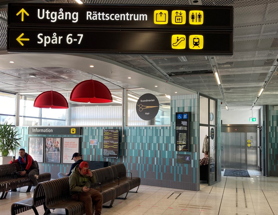 Ute. Till höger om hissarna upp till väntsalen på östra sidan (nära ICA Maxi).