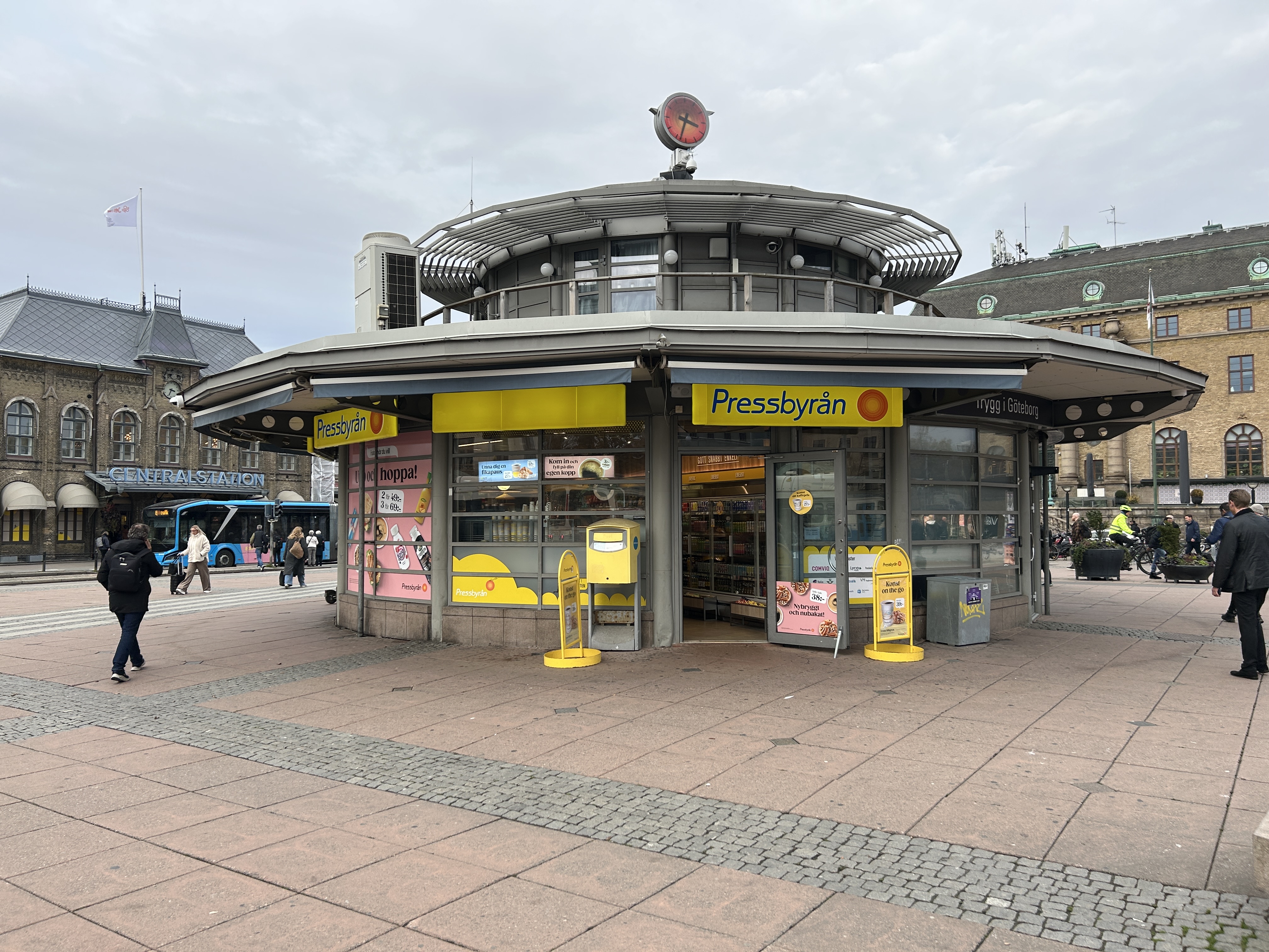 Ute. Drottningtorget, vid Pressbyråns entré i den runda byggnaden på torget. (Mötesplatsskylt saknas f n)