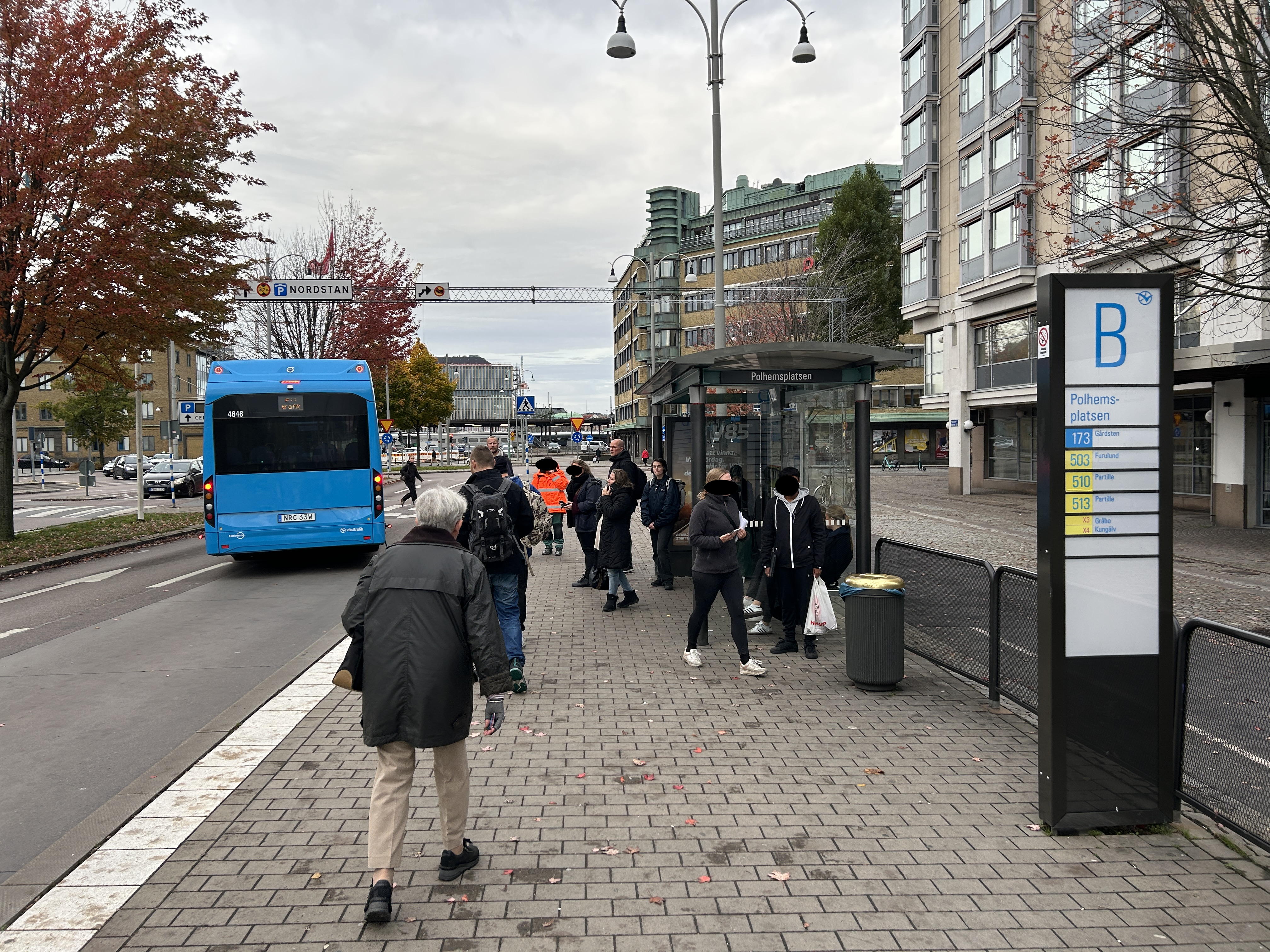 Ute. Polhemsplatsen, väderskyddet vid hållplatsläge B. (Mötesplatsskylt saknas f n)