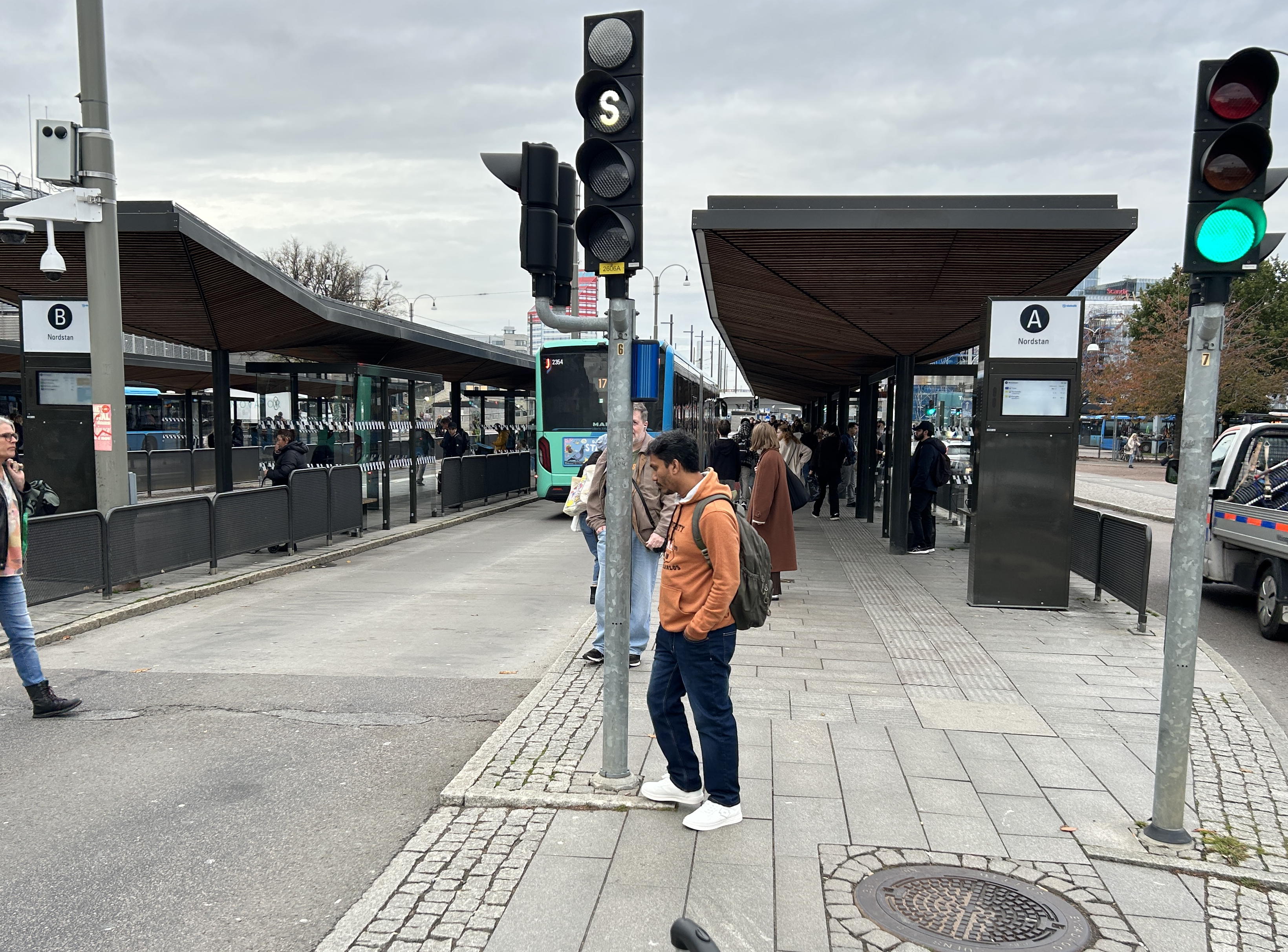 Ute. Nordstan, vid hållplatsläge A vid övergångsstället närmast centralstationen. (Mötesplatsskylt saknas f n)