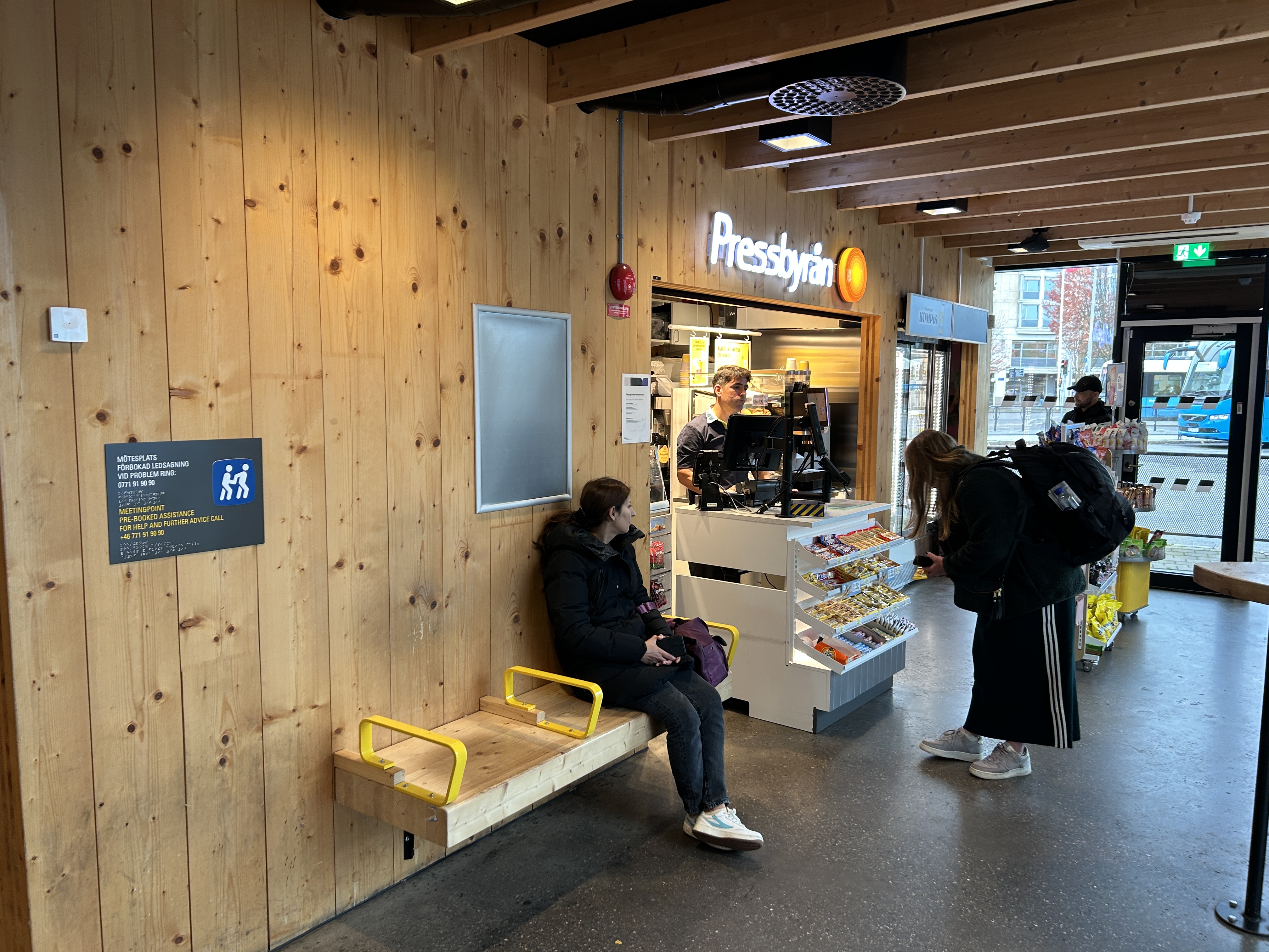 Inne. Åkareplatsen, i väntsalen till vänster om Pressbyrån. (OBS! Fel telefonnummer på mötesplatsskylten, ska vara 0774-445555)