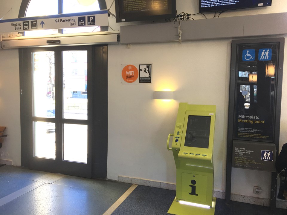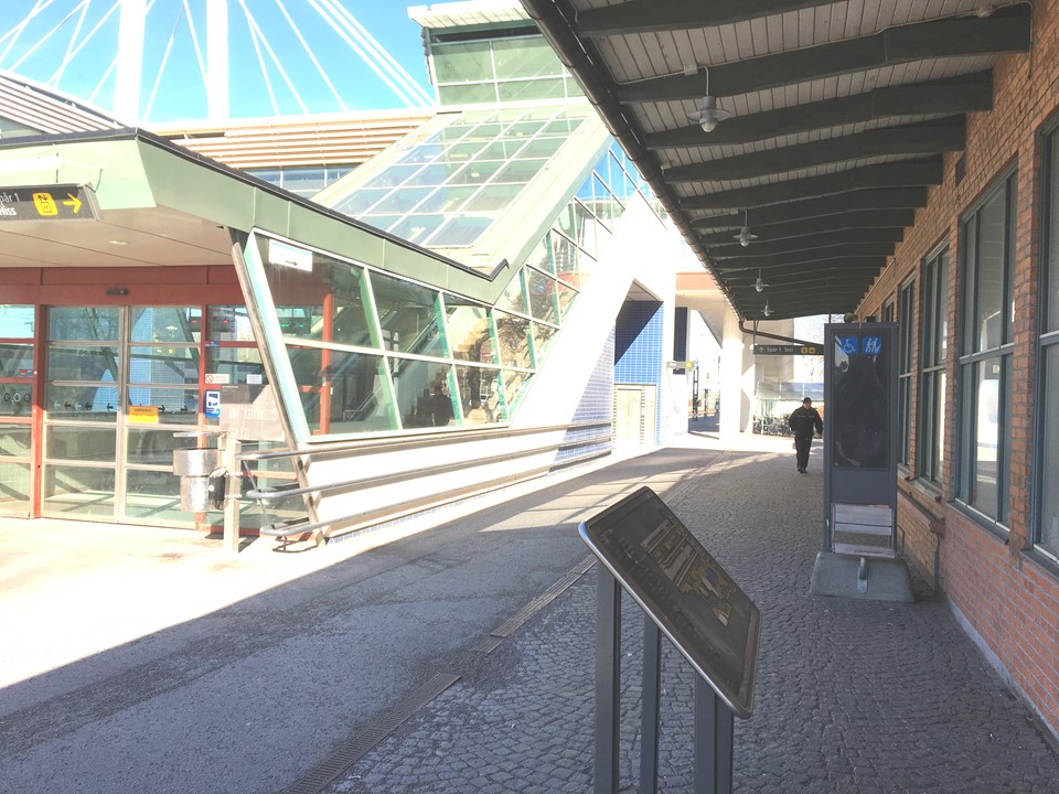 Ute. Vid stationshuset, nära rulltrappor till gångbron över spåren.