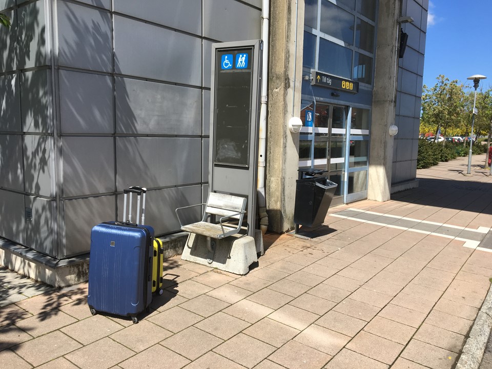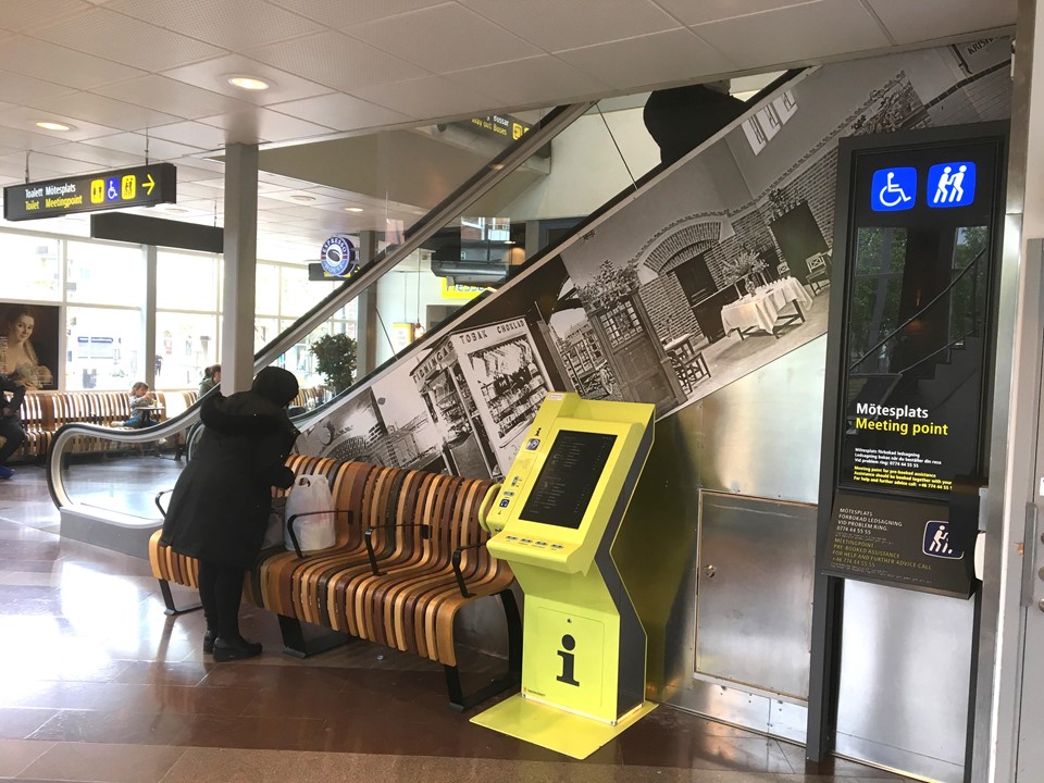 Inne. I nya väntsalen, till höger om rulltrapporna.