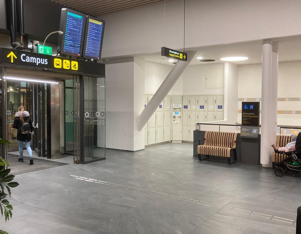 Inne. I väntsal, nära utgång mot Campus/bussterminal och nedgång till spår 3-4 och Skånetrafikens kundtjänst
