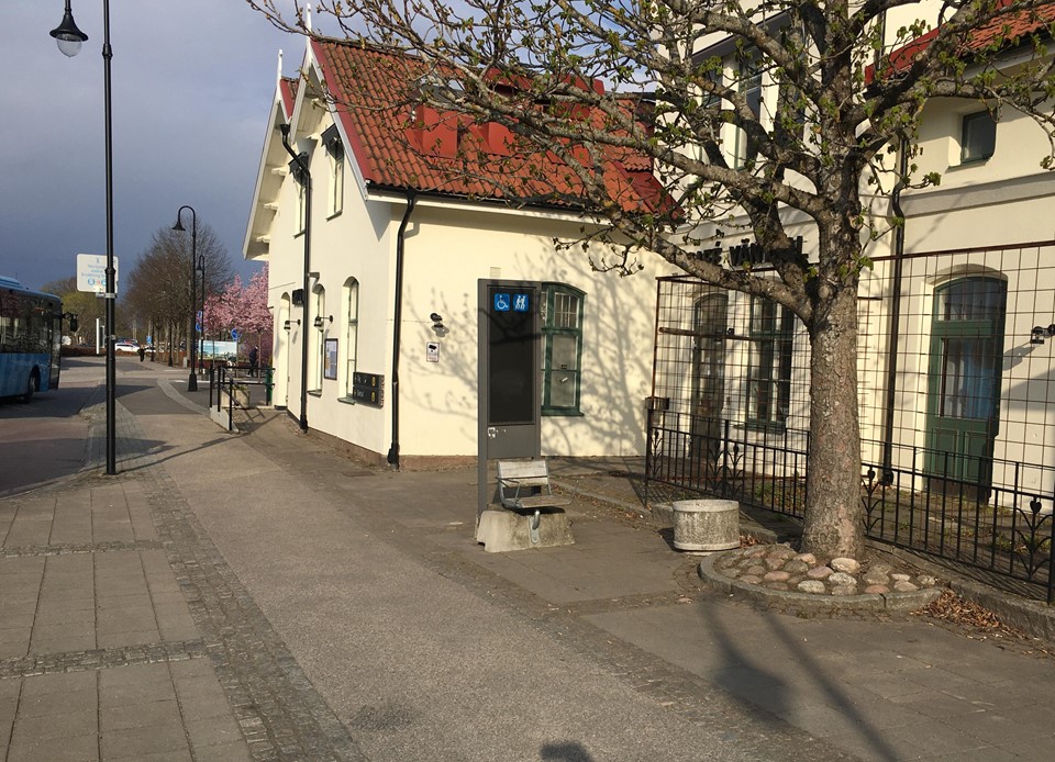 Ute. Vid ingång till väntsal nära busshållplatser.