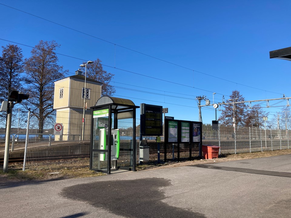 Ute. Vid biljettautomat och informationstavlor nära övergång till plattform.