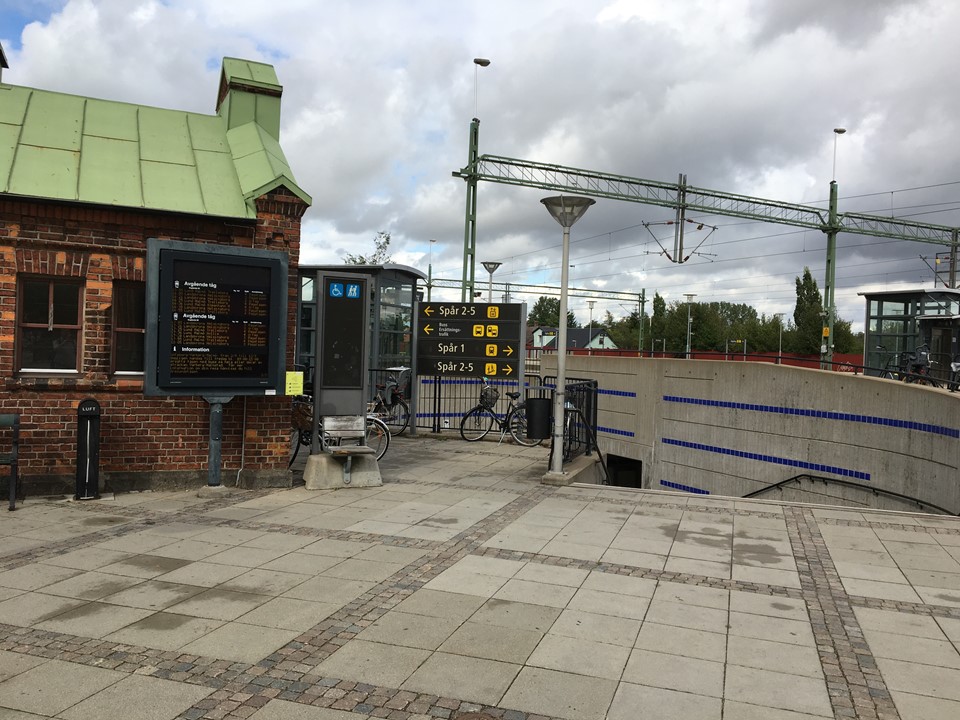 Ute. Till vänster om stationshuset vid informationstavlan och trappor till spåren.
