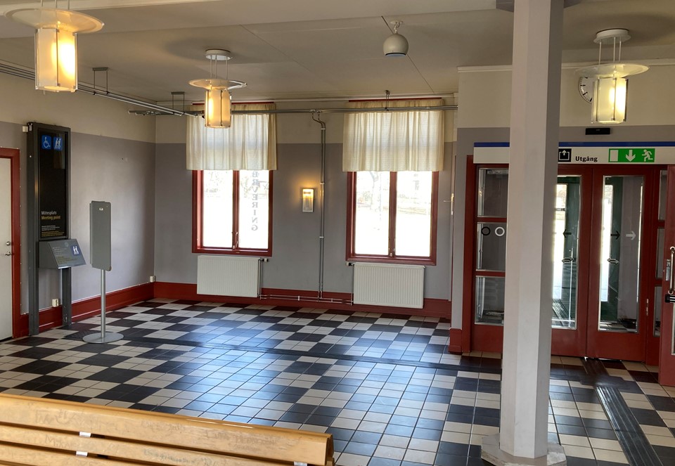 Inne. I väntsal, till höger innanför entrén från gatan.