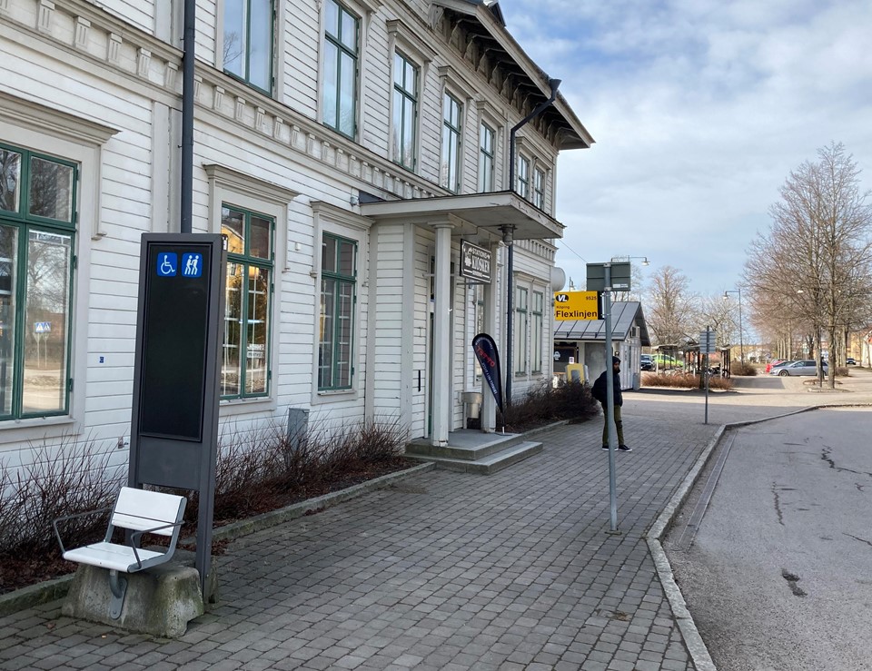 Ute. På vänster sida om huvudentrén på stationshuset vid taxiangöring.