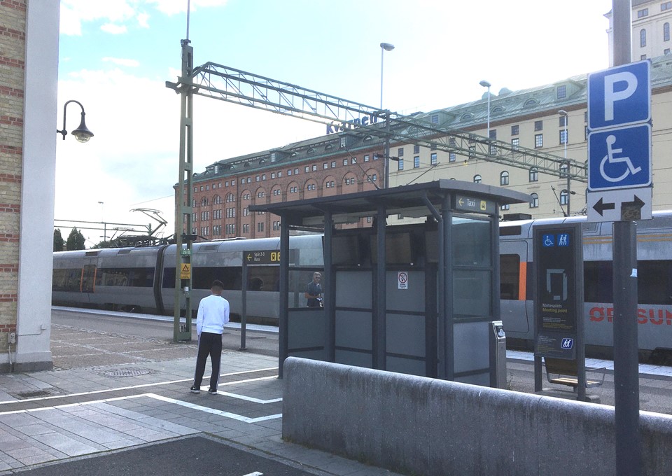 Ute. Till höger om stationshuset vid informationspunkt och taxiangöring.