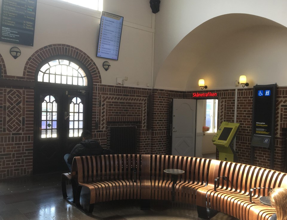 Inne. I väntsal snett till vänster innanför dörrar från spårsidan.