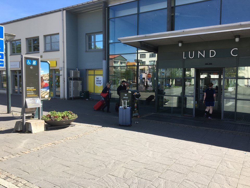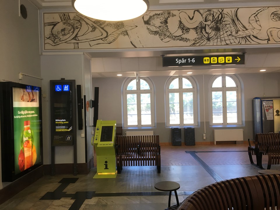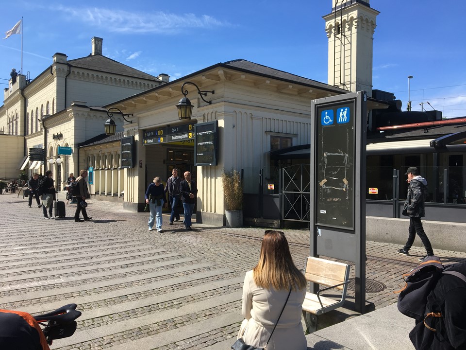 Ute. En bit till höger om gamla stationshuset sett från gatan, nära nedgången under spåren.