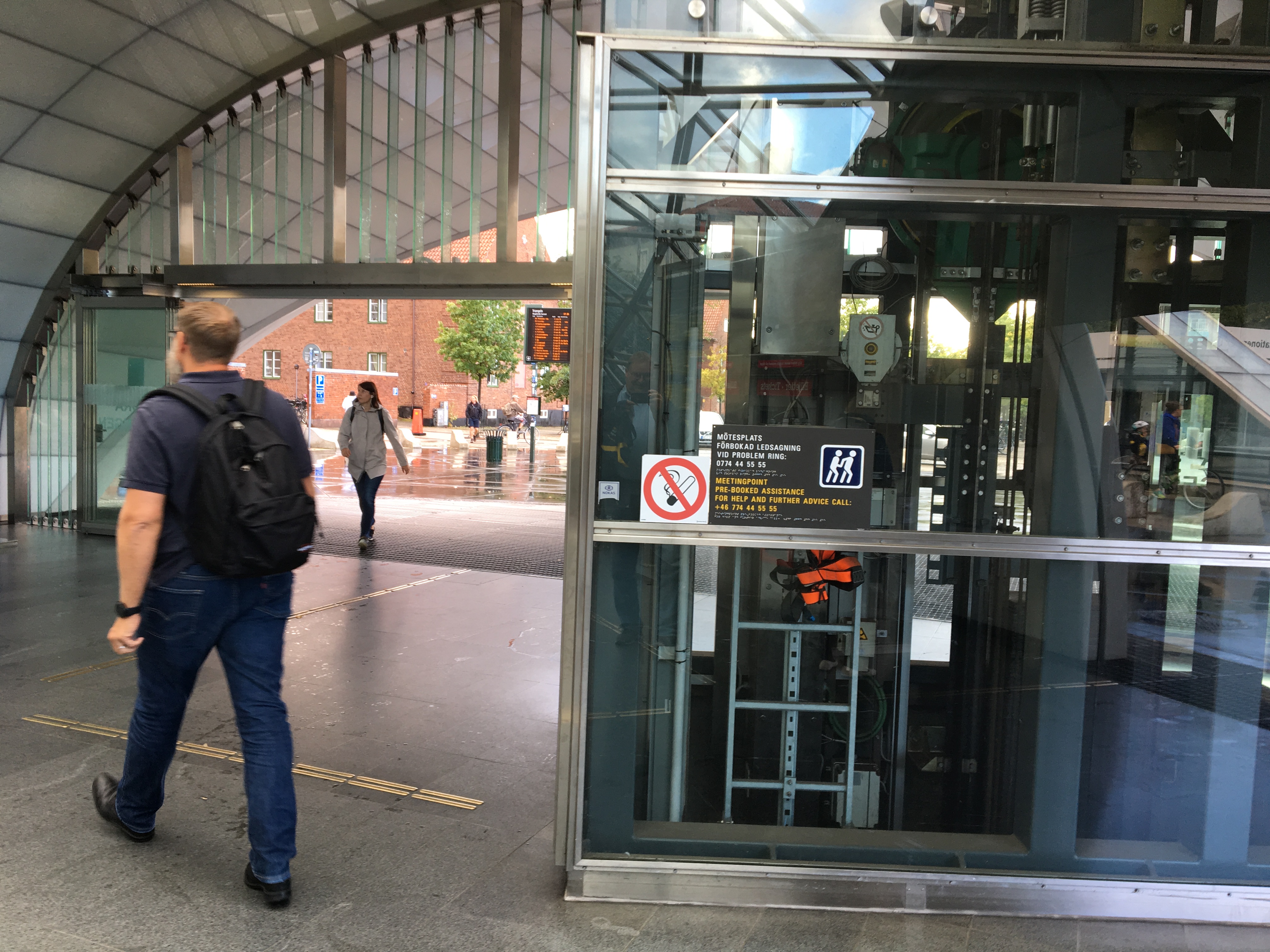 Malmö Triangeln station Uppdaterades senast: 8 juli 2021 Inne. Södra uppgången, hisschaktets vägg bakom entrén Foto: Nïklas Henriksson Samtliga mötesplatser