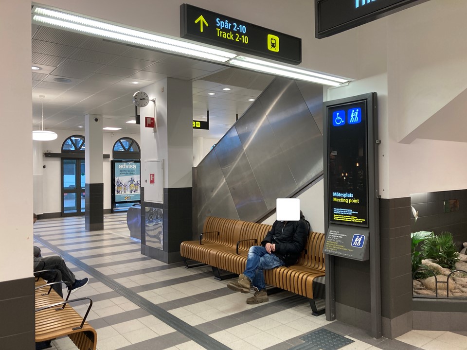 Inne. I väntsal till höger om rulltrappan.