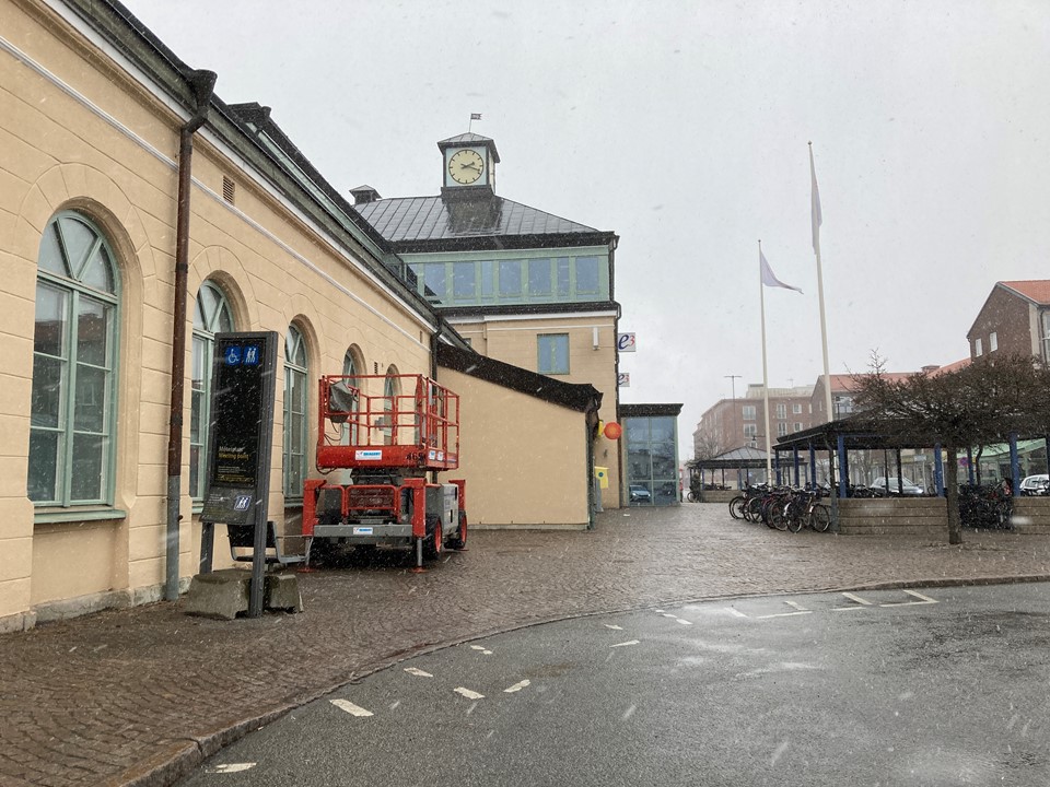 Ute. Till vänster om stationshusets entré, nära taxiangöringen.