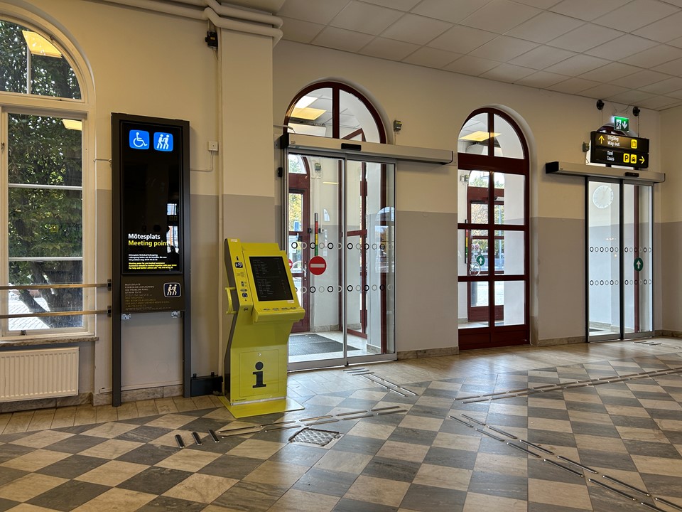 Inne. I väntsal omedelbart till höger innanför entré från gatusidan.