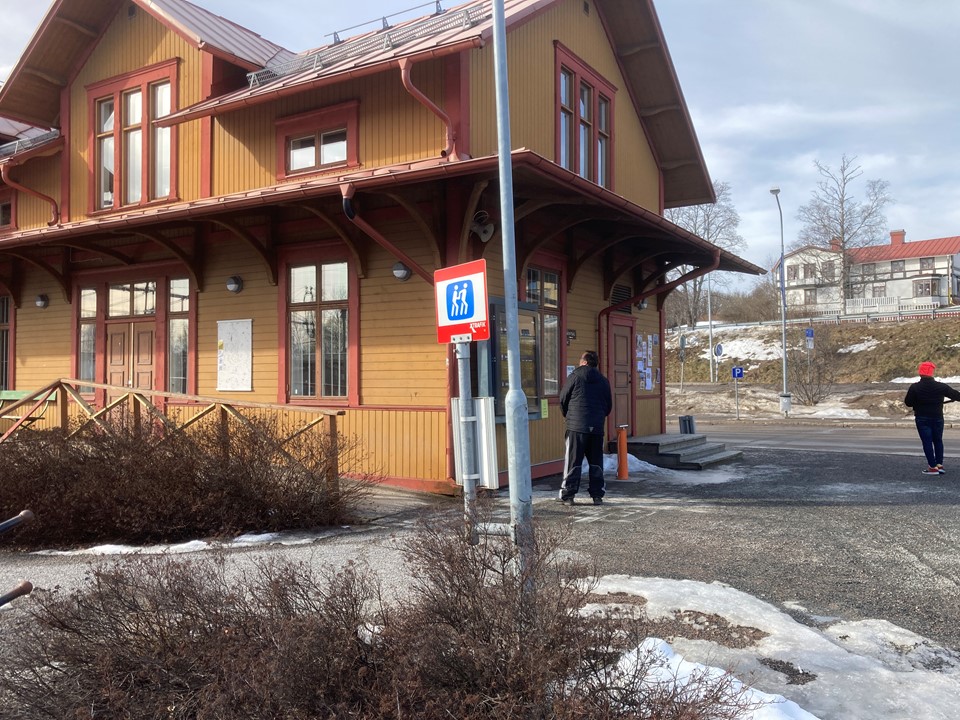 Ute. Vid rampen till väntsalen. (Skyltat med X-trafiks ledsagningsskylt.)