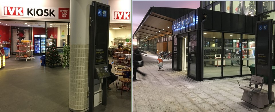 Inne. I väntsal innanför entrédörr snett fram till vänster om ledstråk..