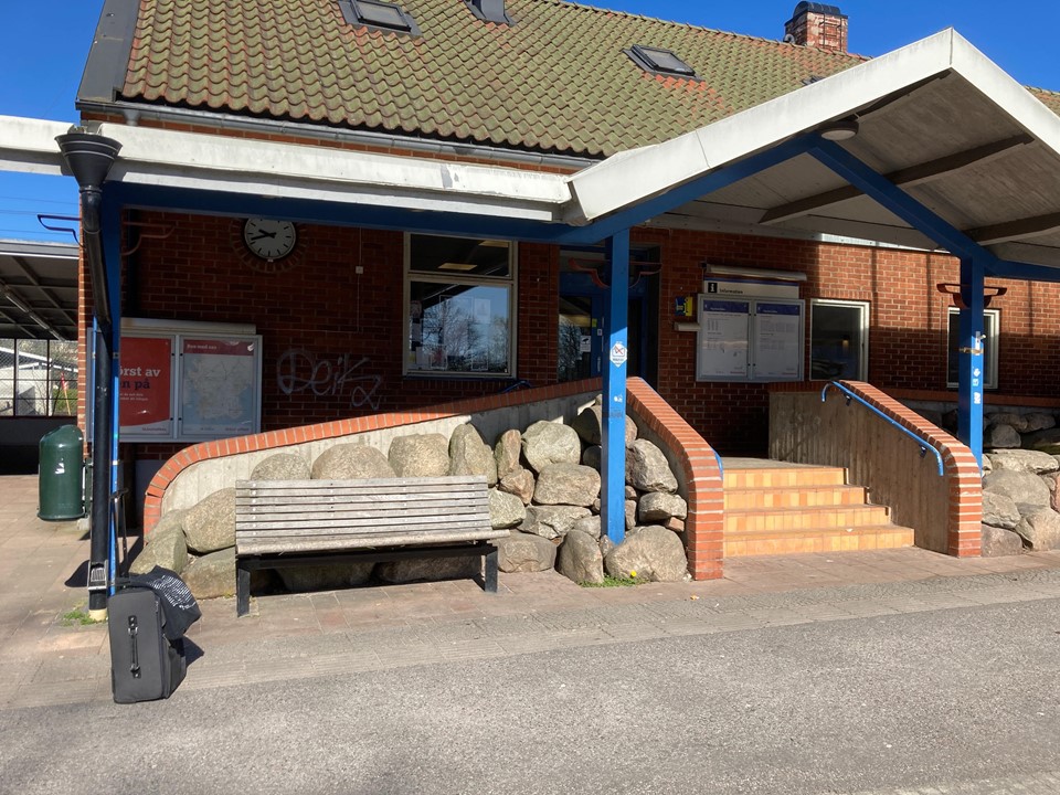 Ute. Bänken vid entrén till väntsalen från Ö Järnvägsgatan. Skylt saknas f n.