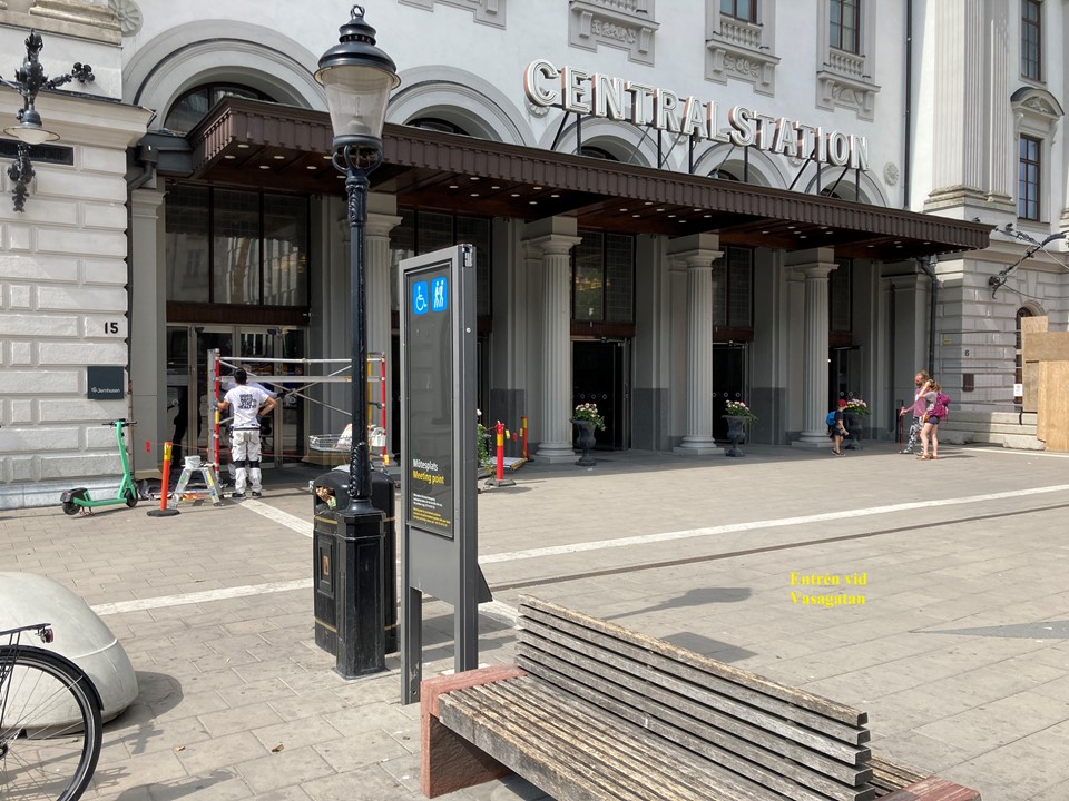 Ute, till vänster om entrén vid Vasagatan, nära Nils Ericsonstatyn.