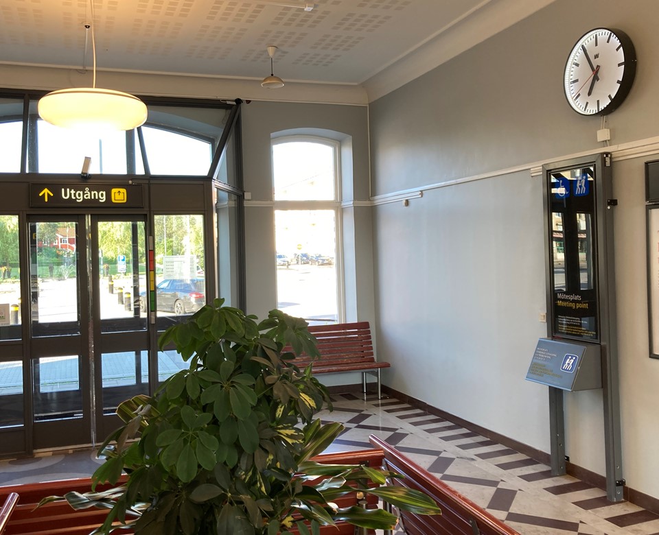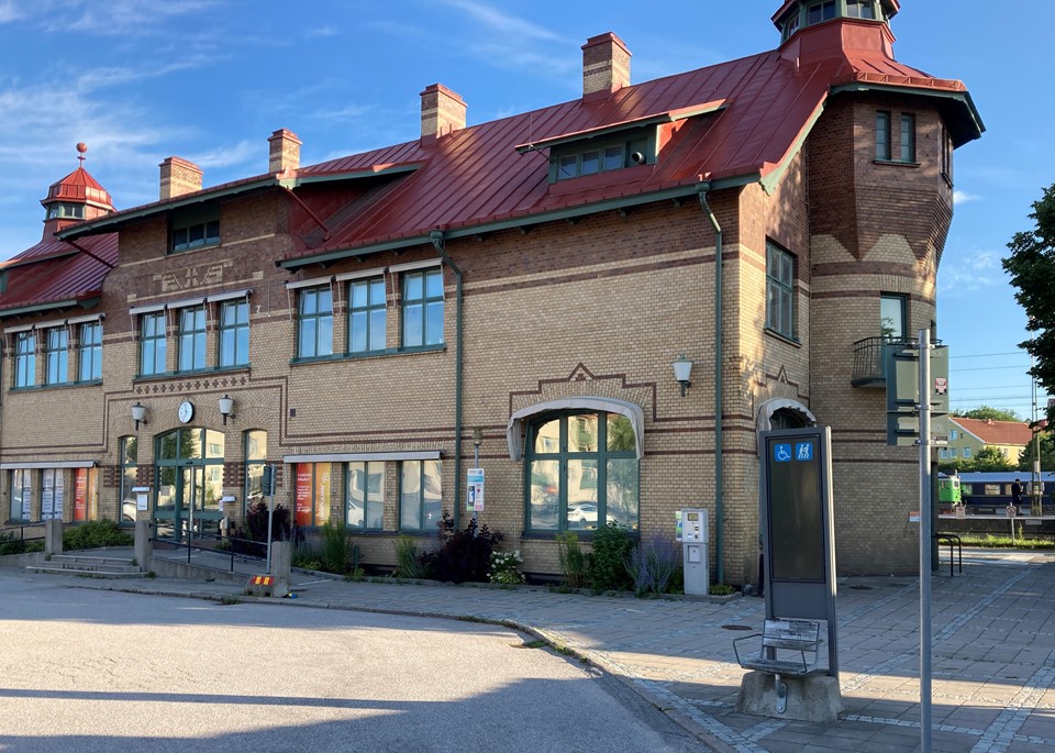 Ute. Till höger om stationshuset nära Pressbyrån.