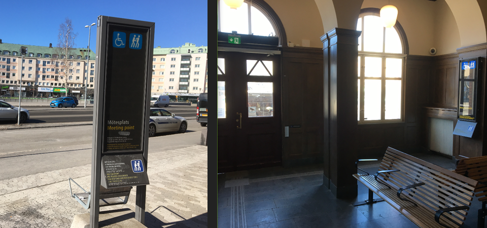Ute: På hörnet av stationshuset till höger om huvudentrén.