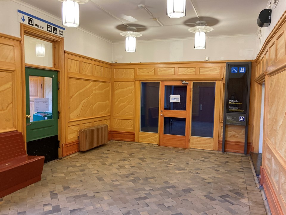 Inne. I väntsalen närmast entrén från gatan (tillgänglig med rullstol endast från entrén vid plattformen).