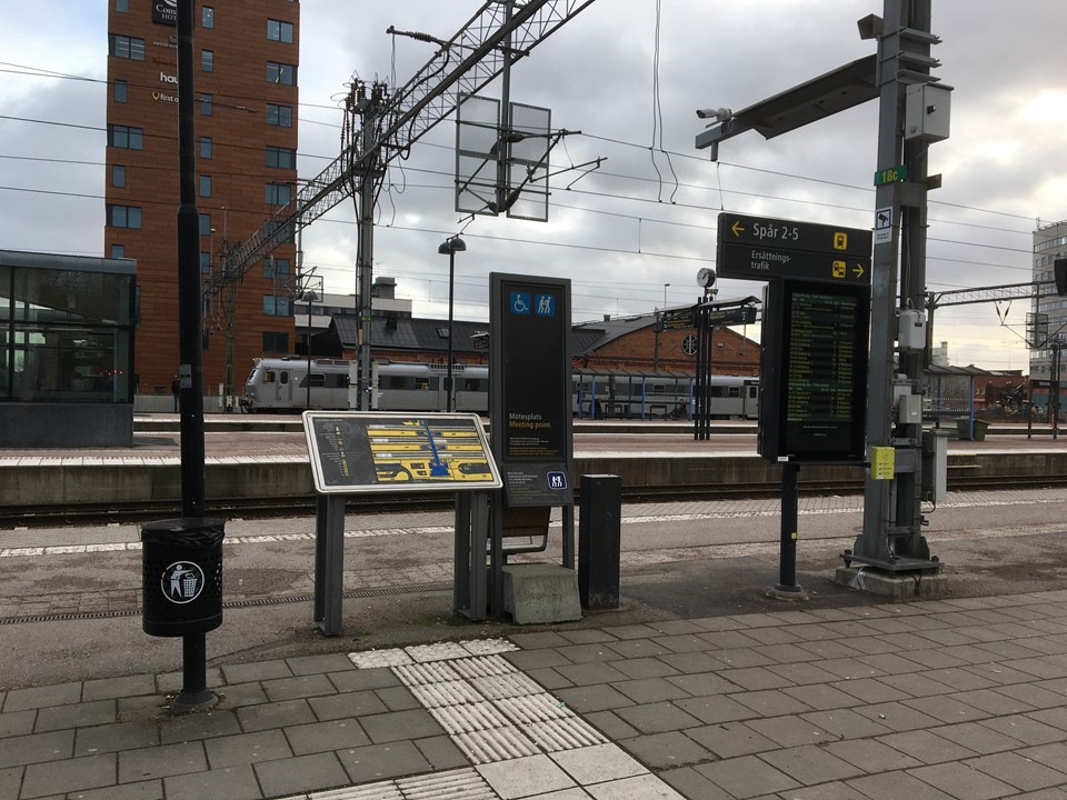 Ute. Till höger om stationshuset nära taxiangöring, intill plattform spår 1 vid taktil karta.